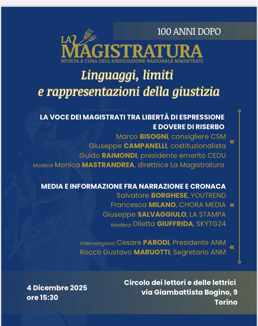Come si racconta la giustizia? Qual è la chiave giusta per informare i cittadini sullo stato della giurisdizione e sugli strumenti necessari per farla funzionare al meglio. Quali i limiti per i magistrati, quali le sfide per l’informazione nell’epoca dei social e del racconto crime. A queste ed altre domande vuole rispondere la rivista La Magistratura in un evento che si terrà a Torino il 4 dicembre al Circolo dei lettori e delle lettrici. Un appuntamento voluto quest’anno a 100 anni dall’inizio della diffusione della rivista, prima che il fascismo la bloccasse nel 1926.