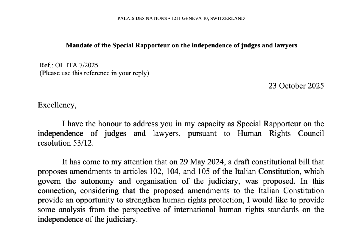 Nella lettera del 23 ottobre 2025, resa pubblica il 28 ottobre 2025, la Relatrice prende atto che il disegno di legge costituzionale italiano propone cambiamenti radicali alla struttura della magistratura, tra cui: la separazione delle carriere tra giudici e pubblici ministeri; la creazione di due Consigli Superiori distinti; l’introduzione di un sistema di sorteggio per la nomina dei membri; la costituzione di una nuova Alta Corte disciplinare, in sostituzione della funzione disciplinare del CSM.